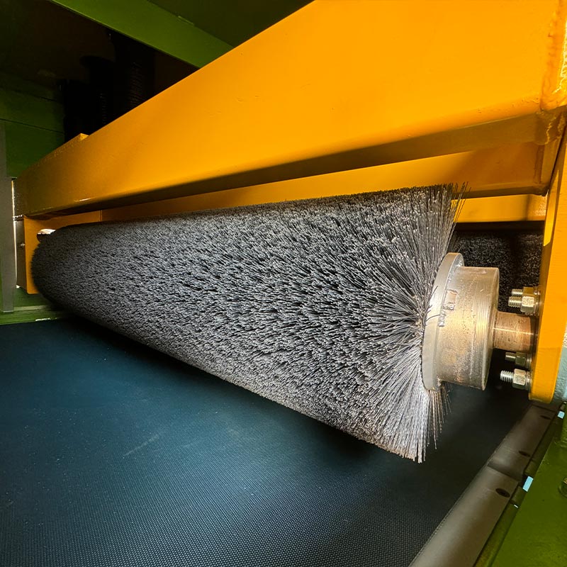 a gumipályás szállítószalag rendszer, ahol 8 készlet csiszolókefe-henger szekvenciálisan egészíti ki a durva és finom